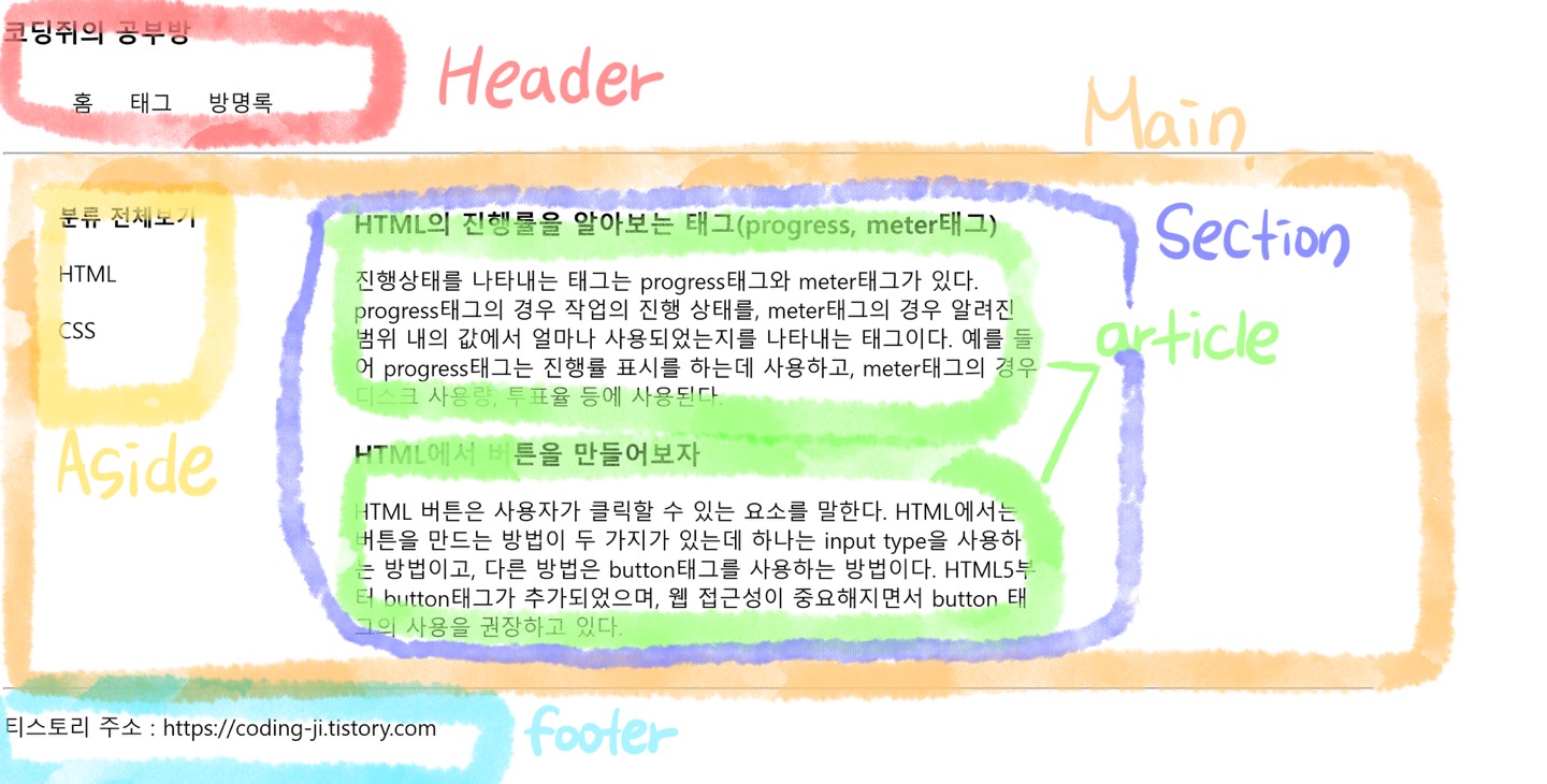 아래의 예제는 나의 티스토리를 기준으로 웹 페이지를 구조화해본 예제이다.