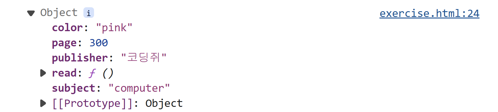 생성된 객체는 console.dir()로 확인이 가능하다. 속성과 기능의 경우에는 해당 내용을 할당연산자를 통해서 변경할 수 있다. 예를 들어 book.color = "blue";를 작성하게 되면 객체 안의 color가 blue로 변경된다.