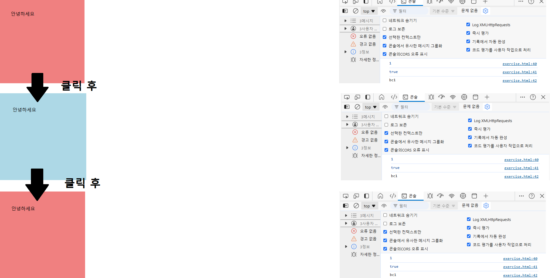 | .toggle(클래스명, true|false) | 해당 요소의 클래스 추가/삭제를 전환한다. 두번째 파라미터는 클래스 존재여부에 관계없이 클래스를 추가 / 제거하도록 하는 강제하는 값이다. |