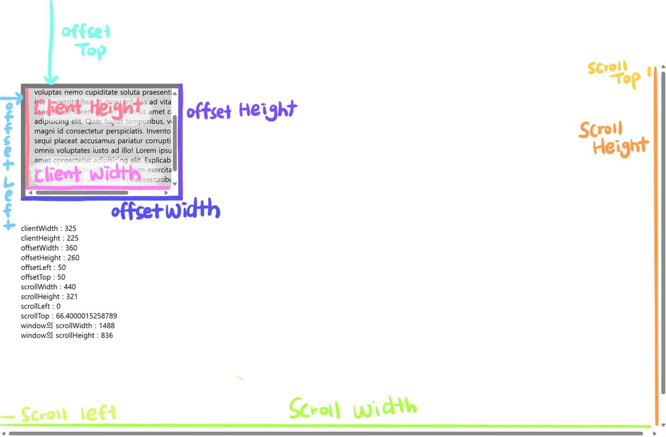 scollWidth는 스크롤 바를 보지 않고도 모든 컨텐츠를 볼 수 있는 너비, scrollHeight는 스크롤바를 사용하지 않고도 모든 컨텐츠를 볼 수 있는 높이를 측정한다. 패딩은 포함되며, 보더는 포함되지 않는다. scrollLeft | scrollTop은 얼마나 스크롤을 했는지에 대한 좌표값을 측정한다.