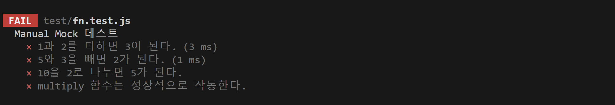 만약 __mocks__ 폴더에 math.js라는 manual mock이 없을 경우에는 jest는 원본 모듈을 그대로 사용하게 되어, 원본 모듈의 함수들이 실제로 호출되므로 테스트가 실패한다.