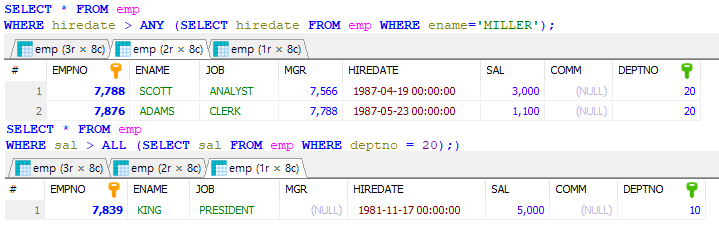 WHERE sal > ALL (SELECT sal FROM emp WHERE deptno = 20);