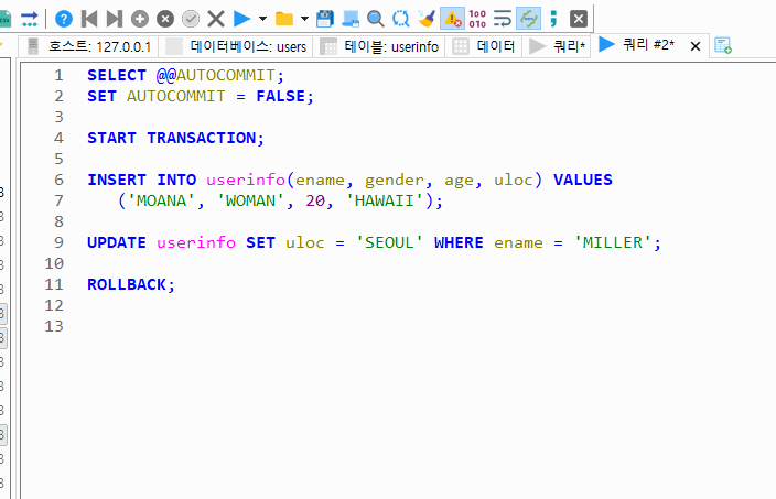위의 SQL을 실행했을 때 INSERT와 UPDATE 문을 사용했지만, ROLLBACK을 통해서 현재 트랜잭션에서 수행한 변경사항을 취소했기 때문에 userinfo 데이터에 INSERT와 UPDATE가 되지 않은 모습을 볼 수 있다.