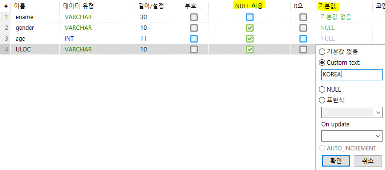 NULL 허용에 체크되어 있을 경우에는 NULL 값을 사용할 수 있고, 기본값을 설정했을 경우 칼럼에 값을 제공하지 않아도 기본값이 자동으로 삽입된다.