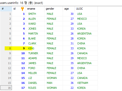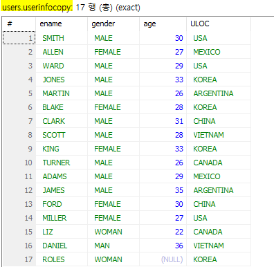 INSERT INTO userinfo(ename, gender, age, uloc) VALUES