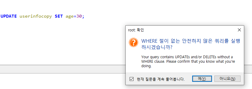 기존 데이터를 수정할 때 사용한다. WHERE문이 준필수로 작성되어야 한다. WHERE이 없을 경우에는 전체 데이터가 변경이 되므로 데이터에 대한 무결점이 깨질 수 있다. 이 경우 데이터베이스 시스템에서 경고를 발생시키기도 한다.
