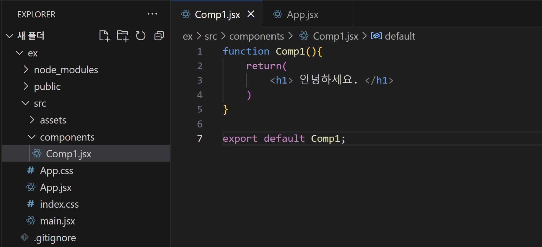 - 컴포넌트 작성 후에 export default 컴포넌트이름; 을 통해 해당 컴포넌트를 다른 파일에서 사용할 수 있도록 한다.