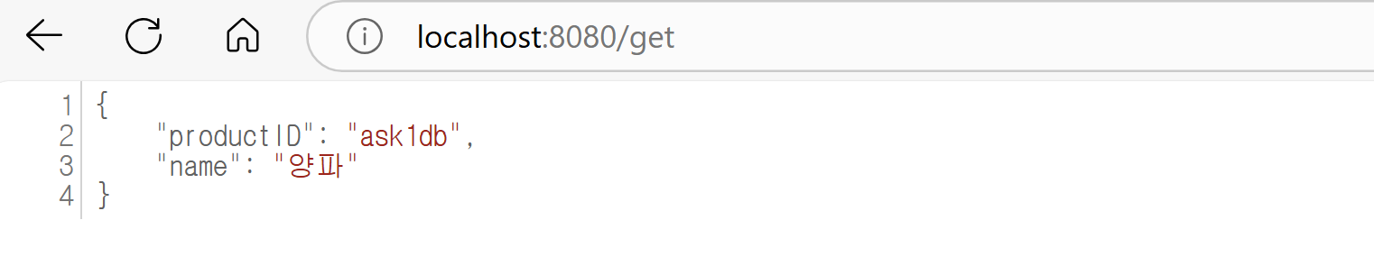 Controller 클래스에서 @RestController와 @GetMapping을 사용하여 URL 경로가 "/get"이고, HTTP GET요청일 때 ProductID 객체를 전송하는 로직을 작성한다.